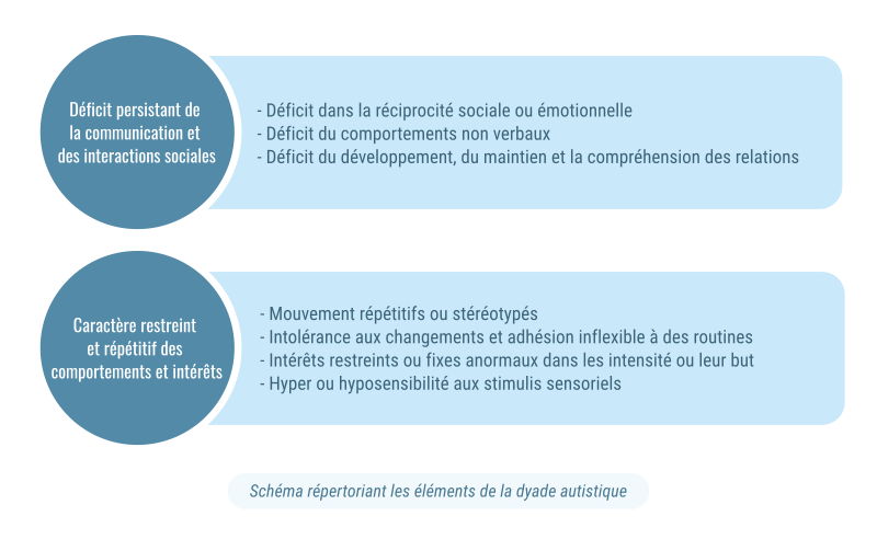 Comme énoncé précédemment, le Trouble du Spectre autistique se caractérise par une Dyade Autistique. Celle-ci regroupe d’une part, les symptômes issus d’un déficit de la communication et des interactions sociales, et d’autre part, les comportements et intérêts restreints et répétitifs. L’ensemble de ces manifestations doit être persistant et observable dans différents contextes de la vie quotidienne.